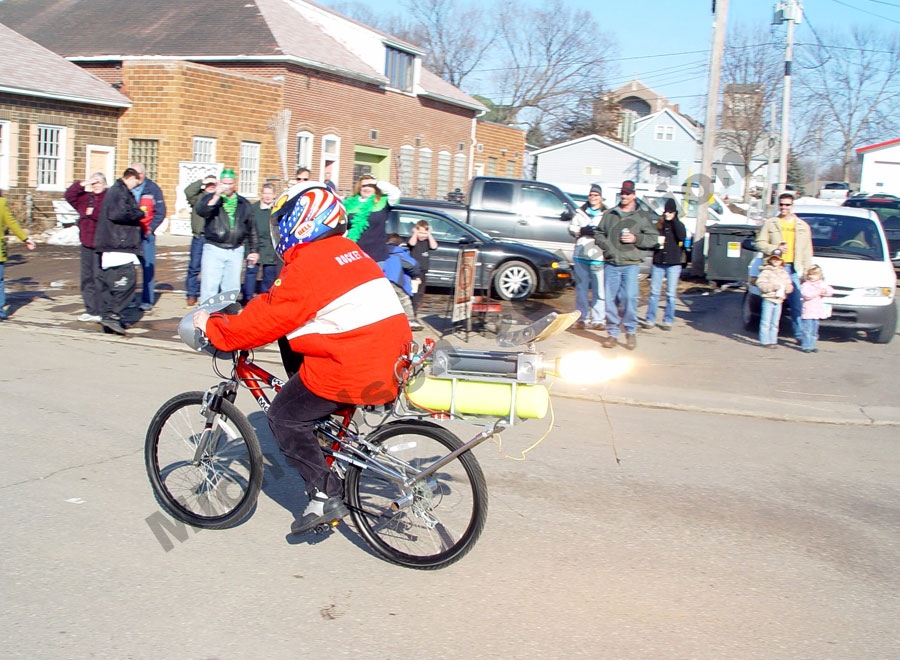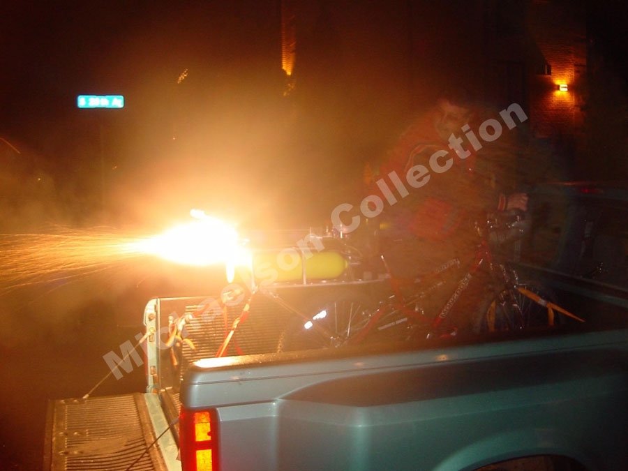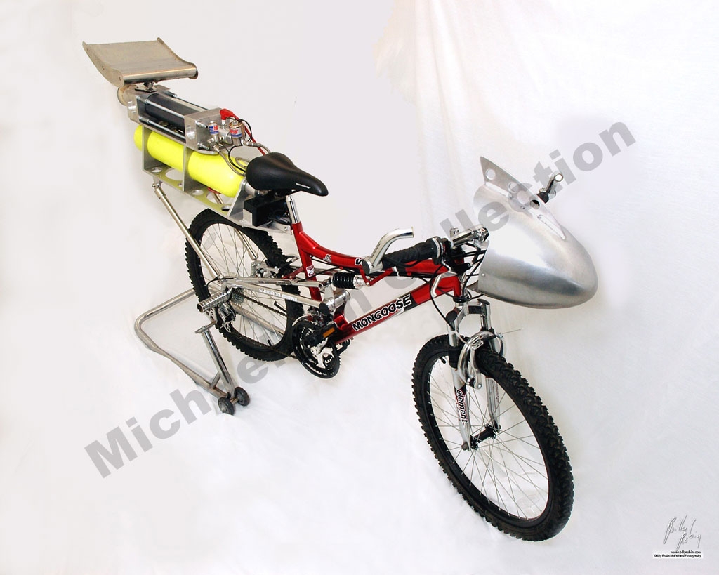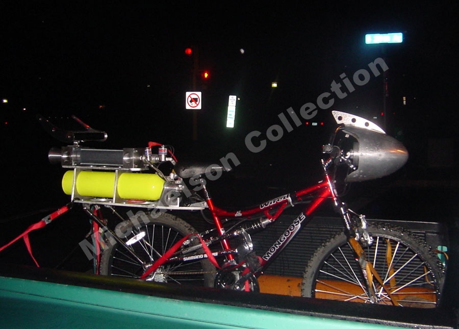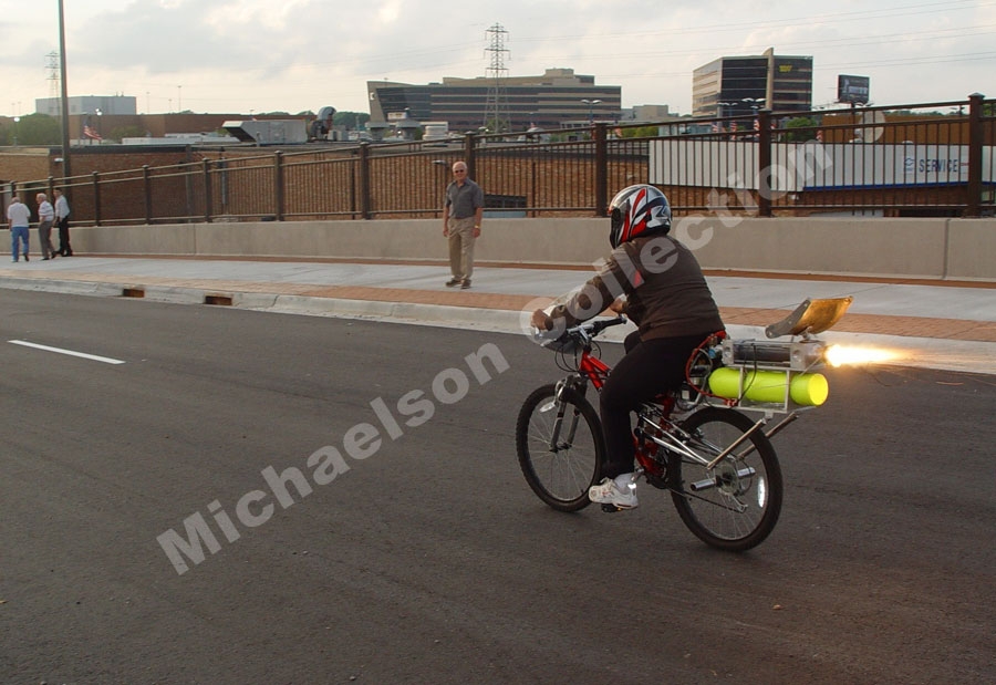 One day my wife Jodi, told me I should go on some kind of exercising program because I started pounding on allot of extra weight, so I went to Target and bought myself a mountain bike to ride around the local lakes. It wasn’t long before I decided exercising was something that I did not look forward to doing.So then I decided that my shiny new mountain bike was a perfect candidate for rocket power. I decided to build a hybrid rocket propulsion system for it and gave it to Jodi. She has ridden the Rocket Bike numerous times over the years. The bike only has 2 speeds fast, and faster.